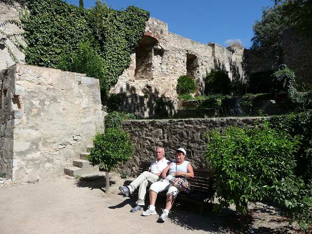 Выйдя из музея, мы обошли Кафедральный собор и за ним обнаружили несколько замечательных уютных зеленых двориков среди крепостных стен. Здесь мы и расположились отдохнуть и набраться сил перед возвращением в Бланес. Слева от нас небольшая лесенка ведет за каменную стенку. Там еще в один дворик, там тень и не так жарко, но скамейка в этом дворике была занята: на ней спал вполне приличный дядечка. Мы не стали ему мешать.