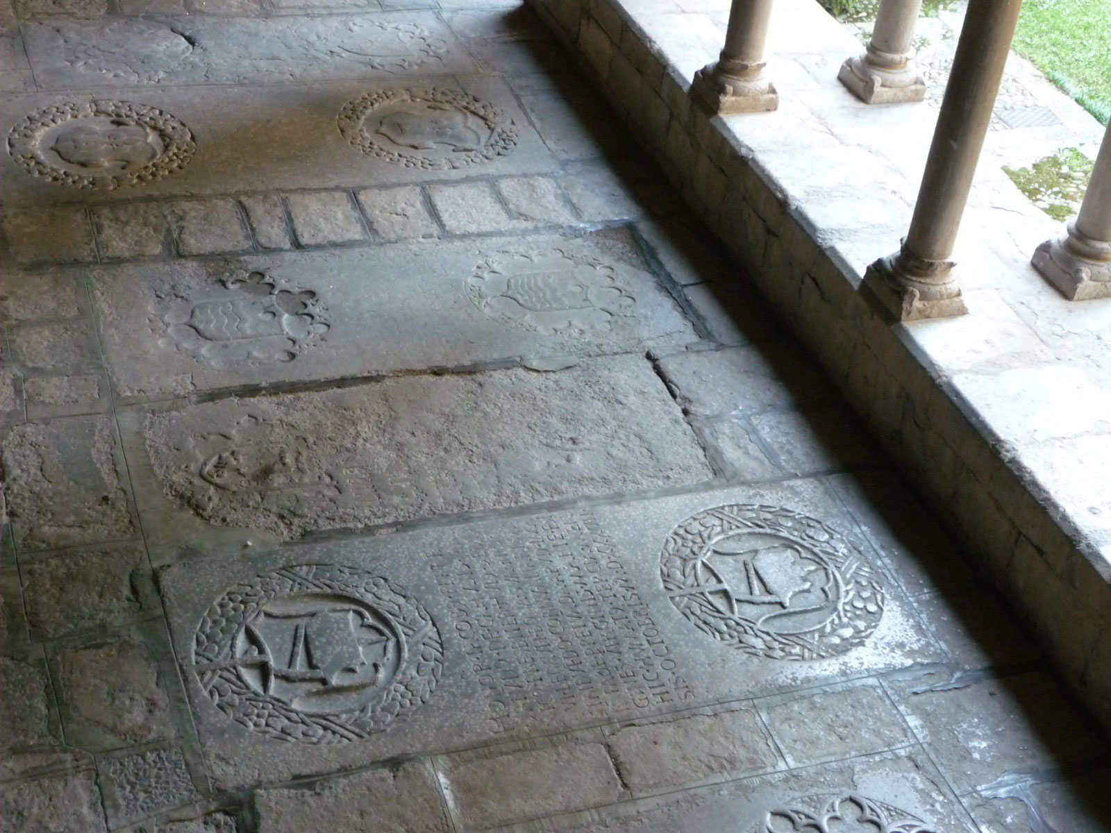 Это внутренний дворик Кафедрального собора. Если лестница к Кафедральному собору — это 17 век, то вот этот внутренний дворик — 12 век! И как все неплохо сохранилось! Плиты, по которым ходят, — это фамильные плиты знатных людей Жироны. Сидим на солнышке, смотрим на Кафедральный собор с тыльной стороны, наблюдаем как на одной их крыш соборного здания рабочие ремонтируют крышу. На наши несколько евро, потраченных на билеты в музей, тоже что-нибудь скоро отремонтируют.