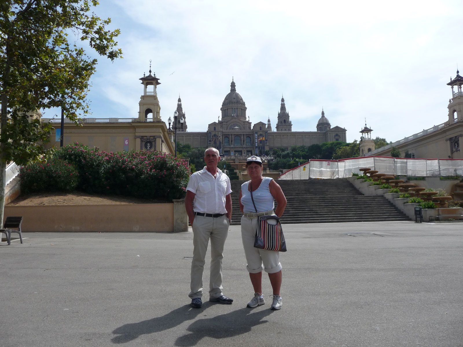 В центре зеленеет Магический Фонтан. Мы его еще увидим в свое время, когда стемнеет. Светомузыкальное шоу под классическую, рок- и поп-музыку длится около 2 часов. На самом верху, около Дворца, есть несколько рядов широкой лестницы, и на ней, как в зрительном зале, располагаются зрители, чтобы любоваться Барселоной. И часто перед ними около ограды выступают разные самодеятельные артисты.